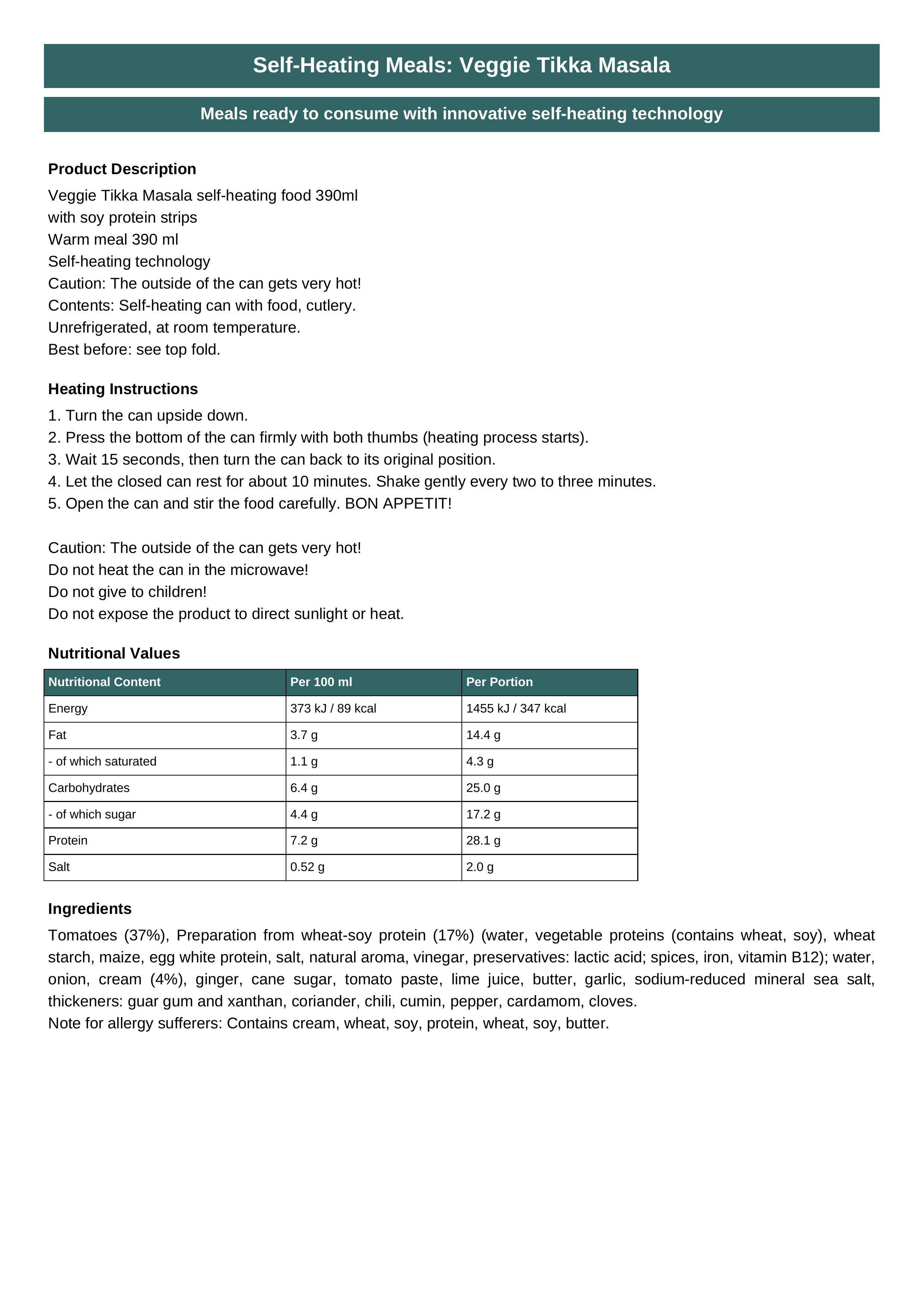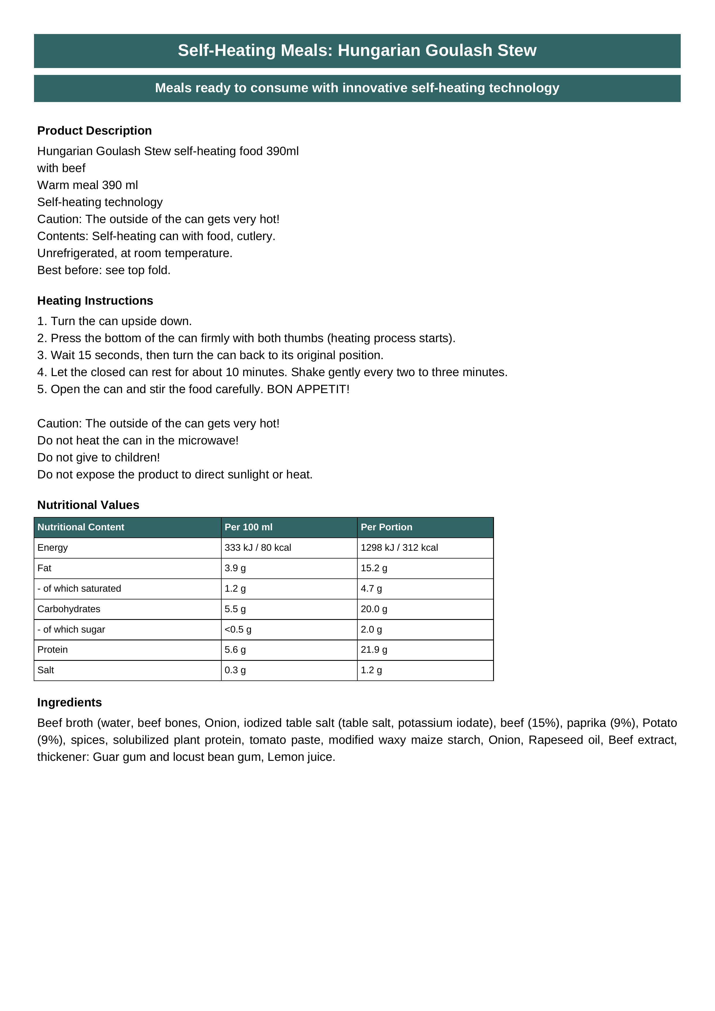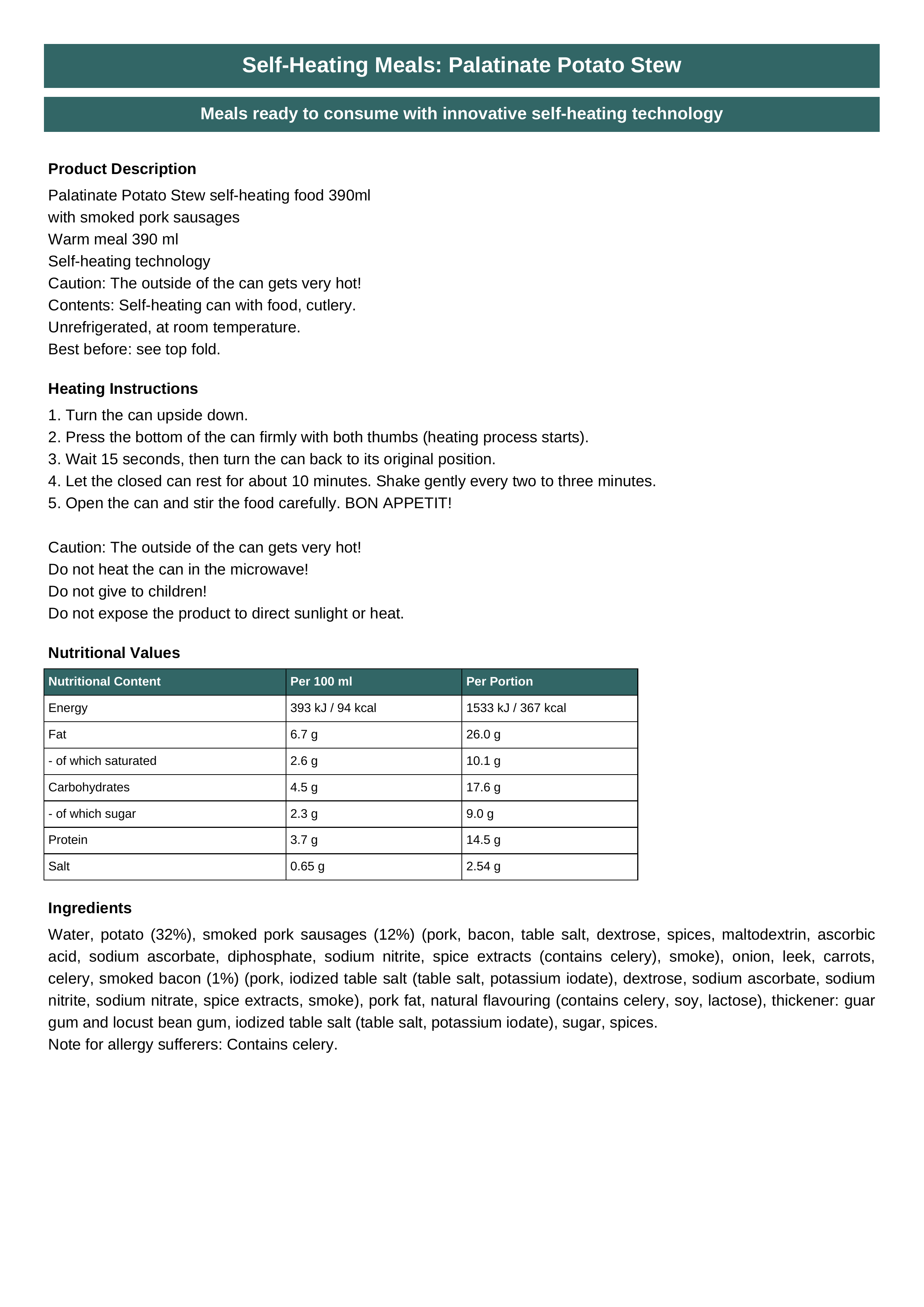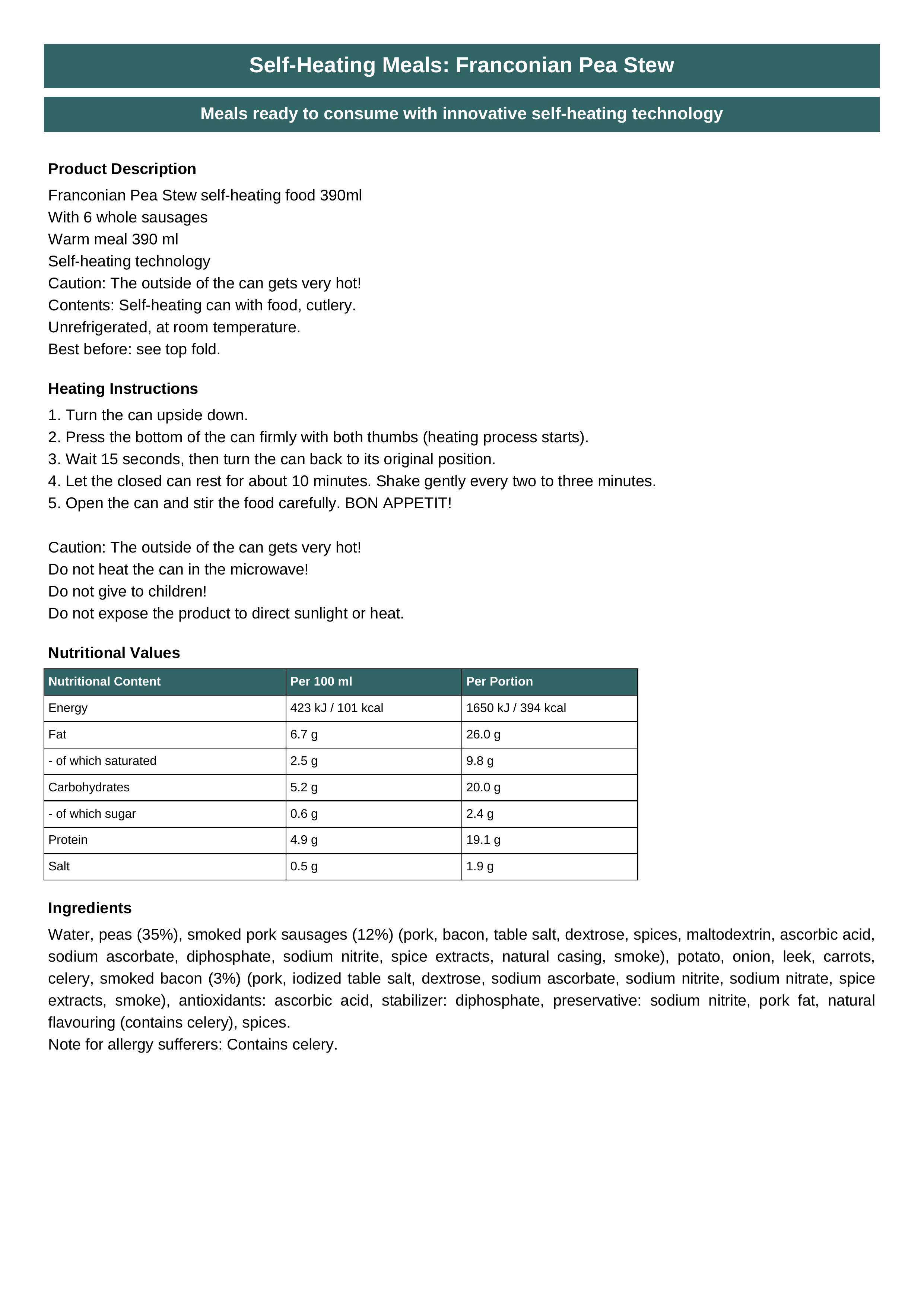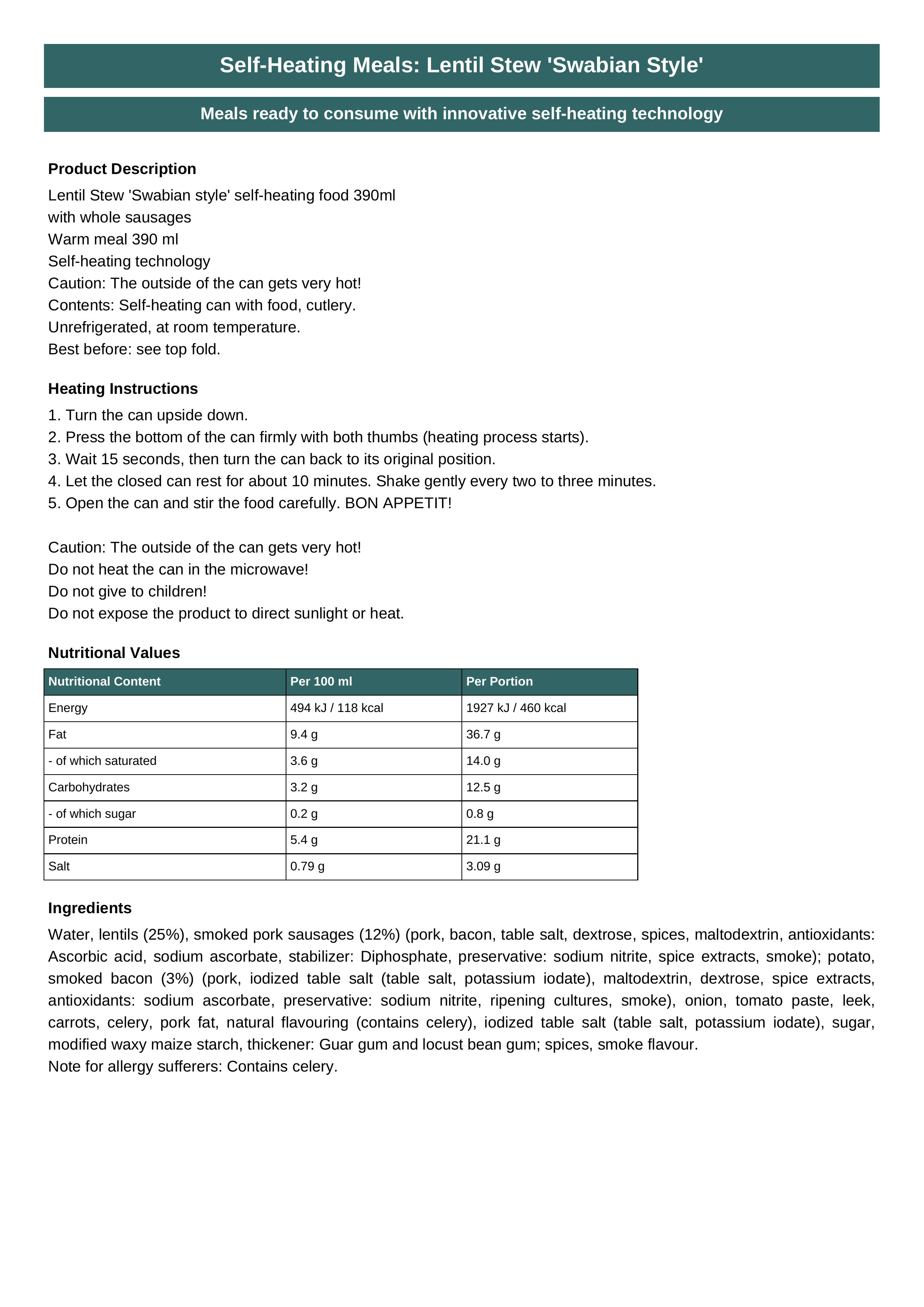 The time required to prepare the meal varies depending on the contents of the can. You can open the can after about 7-8 minutes and stir the food with the included cutlery. Stirring speeds up the absorption of heat.